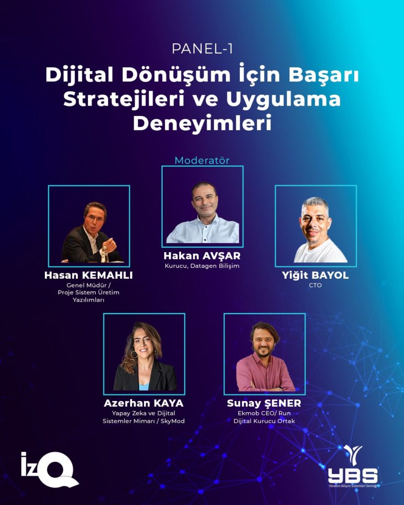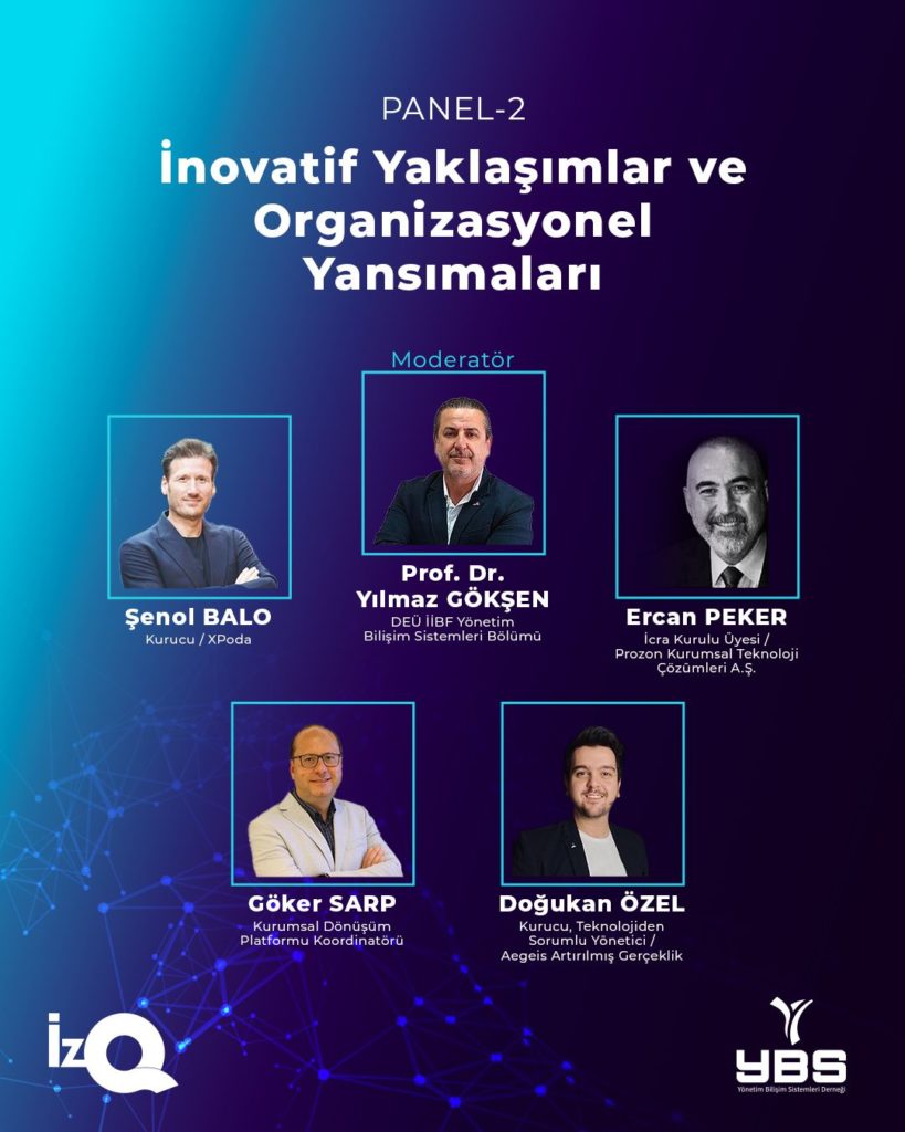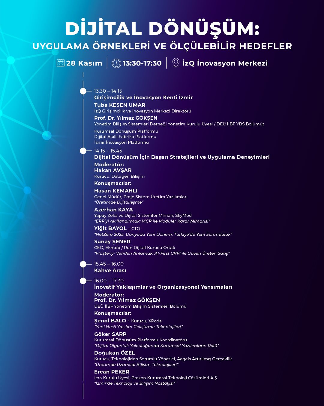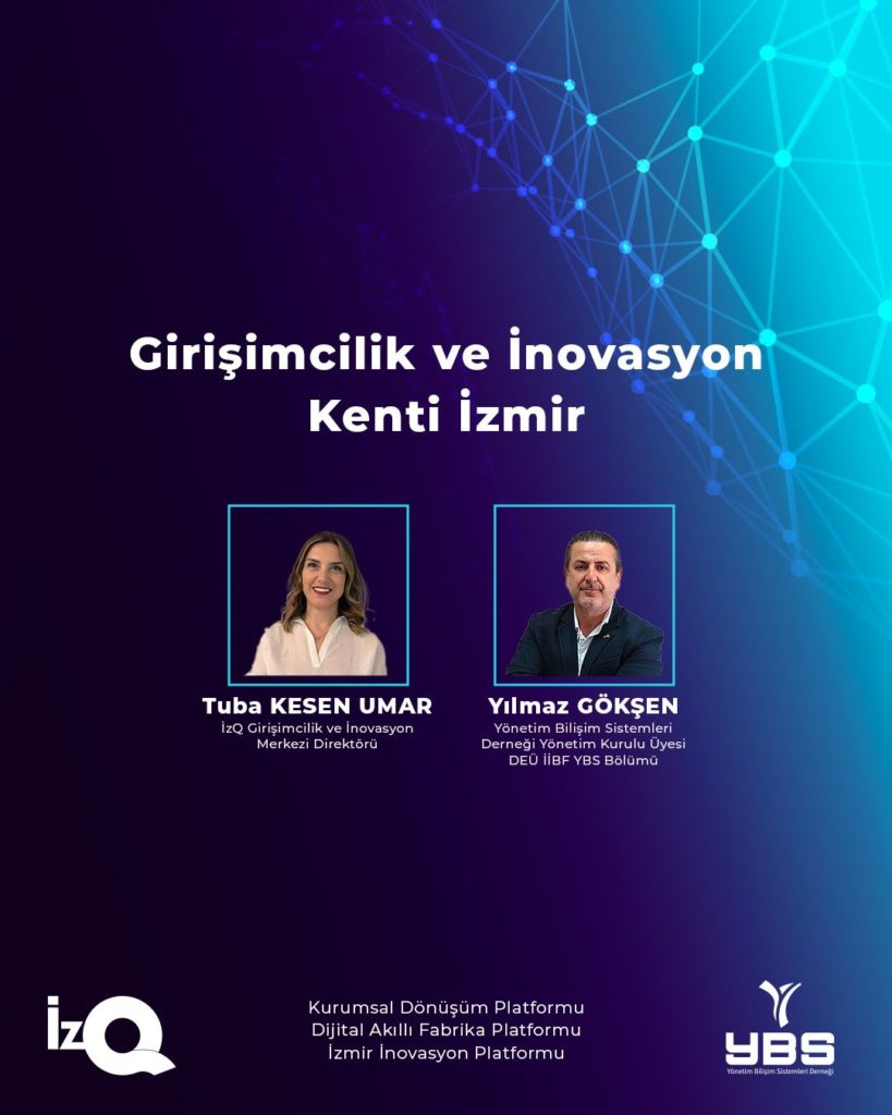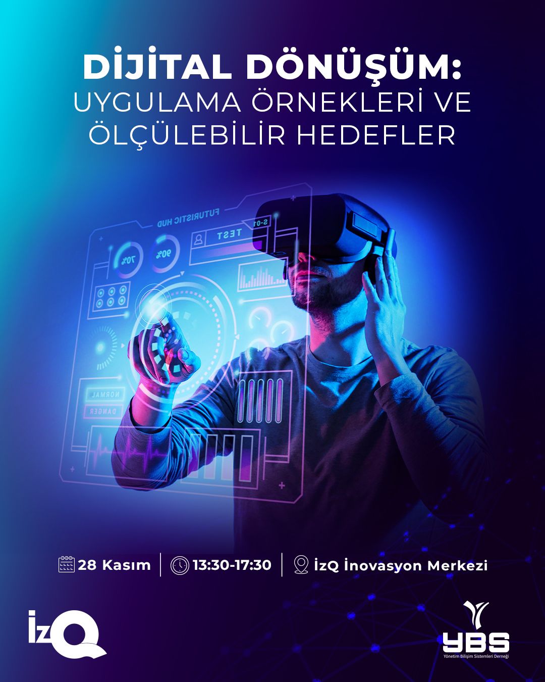 İzQ Girişimcilik ve İnovasyon Merkezi ile Yönetim Bilişim Sistemleri Derneği (YBS Derneği) iş birliğiyle düzenlenen etkinliğimizde, dijital dönüşümün uygulama alanları, inovatif yaklaşımları ve ölçülebilir hedefleri alanında uzman isimlerle ele alıyoruz.